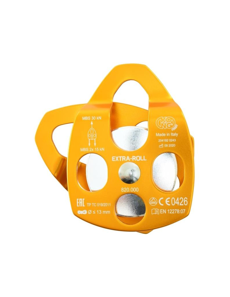 Poulie Extra Roll KONG haute performance pour levage et redirection. Flasques mobiles et roulements à billes pour une mise en place rapide et fluide. Deux points d’attache pour des montages polyvalents. Certifiée EN 12278 pour un usage professionnel.