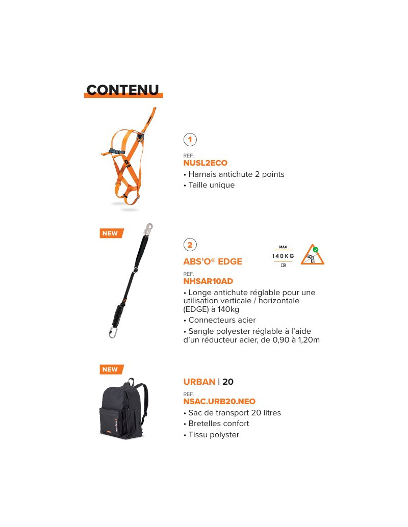 - Solution complète : harnais, longe antichute réglable et sac de transport
